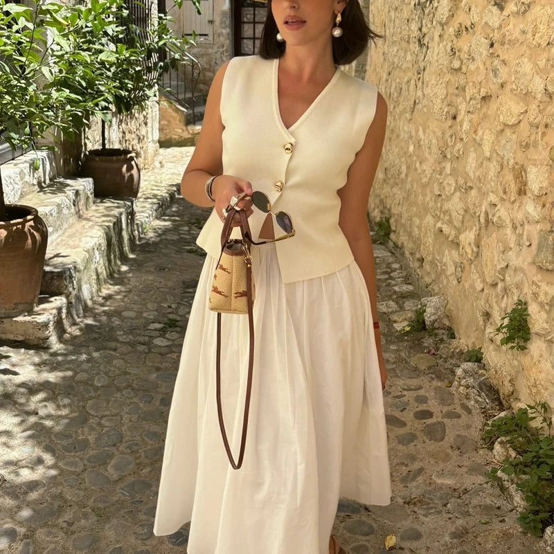 De Elise Knit Vest straalt tijdloze elegantie uit. Het ingewikkelde ontwerp met knoopsluiting geeft je outfit een chique uitstraling, terwijl de zachte gebreide stof zorgt voor comfort en klasse. Perfect te combineren met een rok of jeans voor zowel een casual daglook als een stijlvolle avondoutfit.